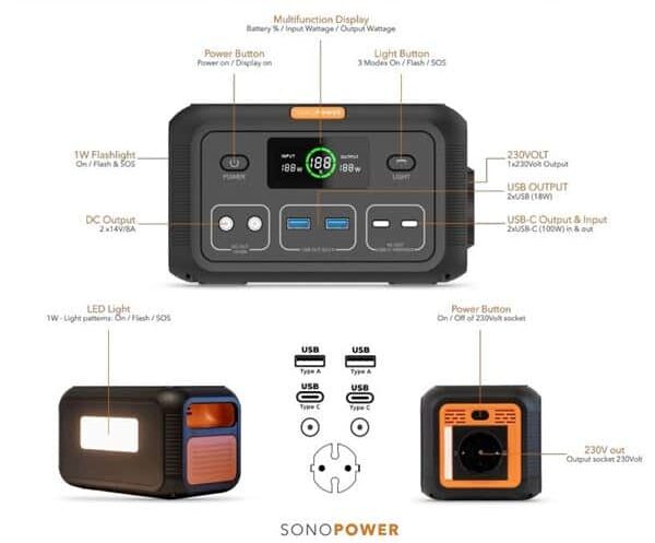 SonoPower MPS100 är en kompakt, kraftfull, portabel och mångsidig Power Station med ett modernt litium-järnfosfatbatteri på 20700 mAh – perfekt för mobilt arbete, camping eller nödsituationer.