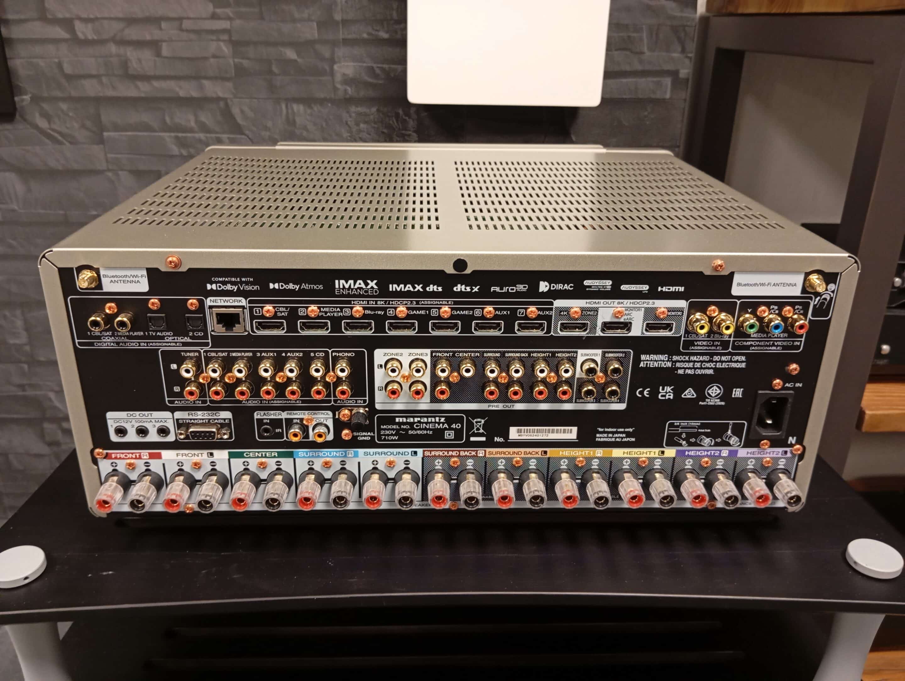 Cinema 40 har hela 7st HDMI-ingångar, samtliga kompatibla med HDMI 2.1 och tre HDMI-utgångar, dubbla koaxiala och optiska ingångar, sex stereo RCA, Phono (MM), fyra subwooferutgångar, 11.4 Pre-Out, och många fler.