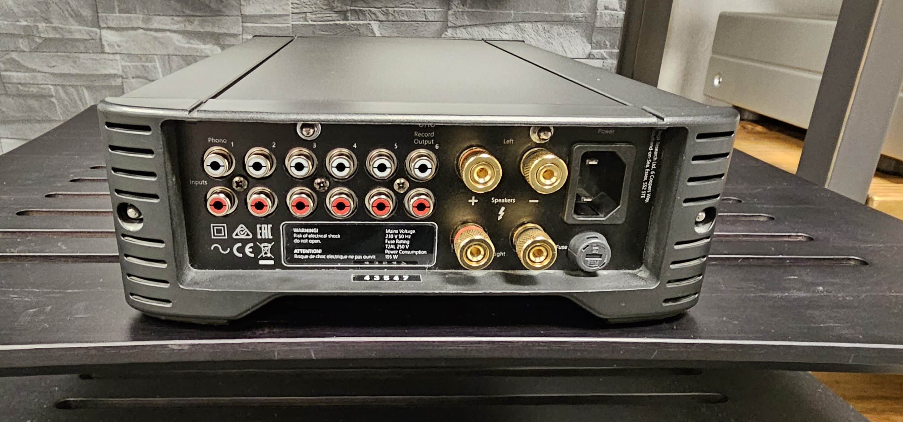 • Inbyggt RIAA steg för MM pickuper. 2 x 50 Watt i 8 Ohm (RMS) 218 × 80 × 340 mm 6 kg