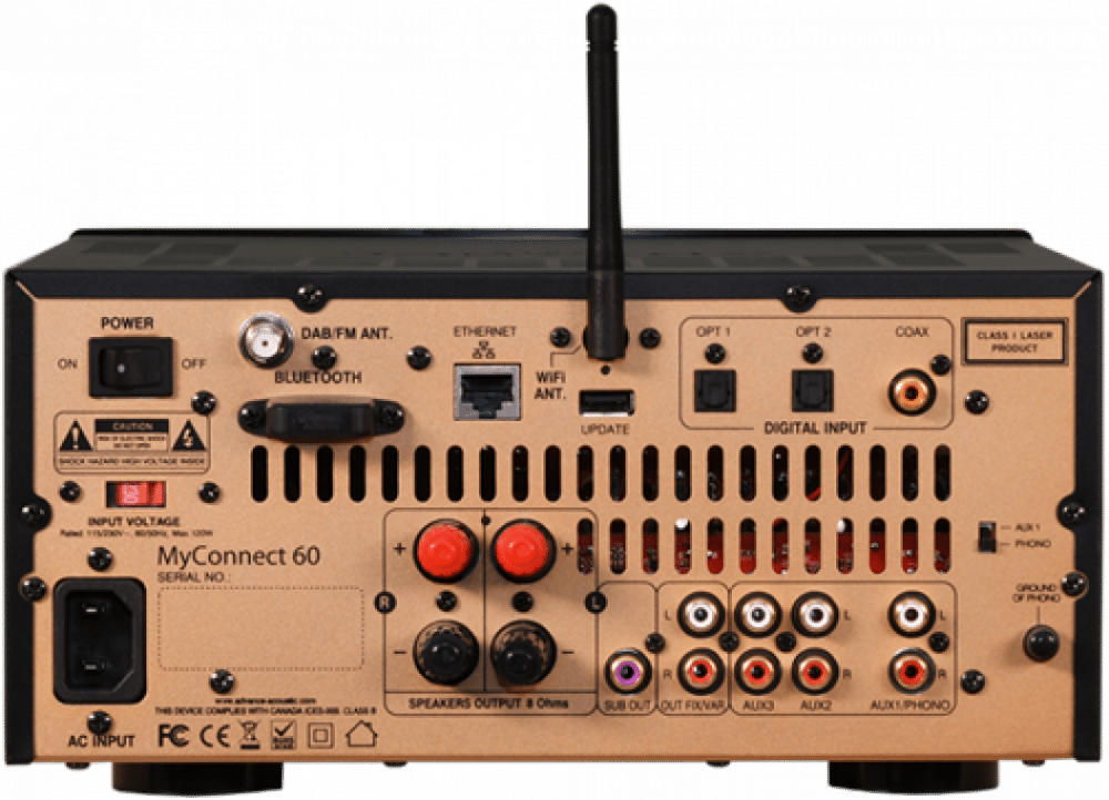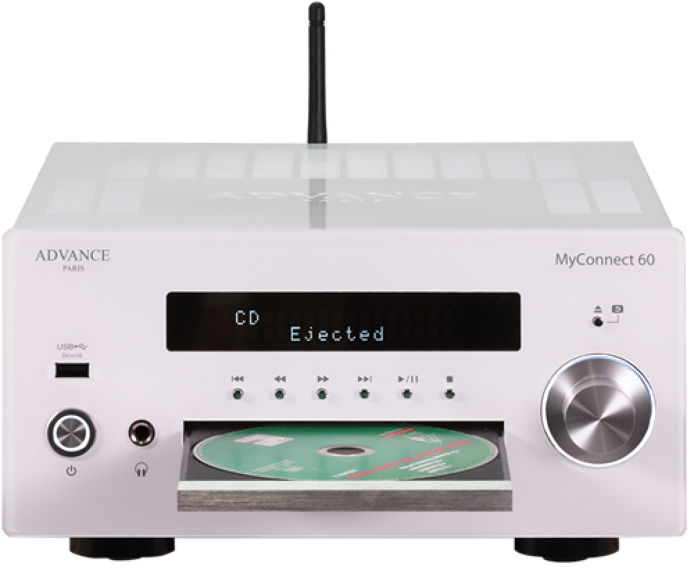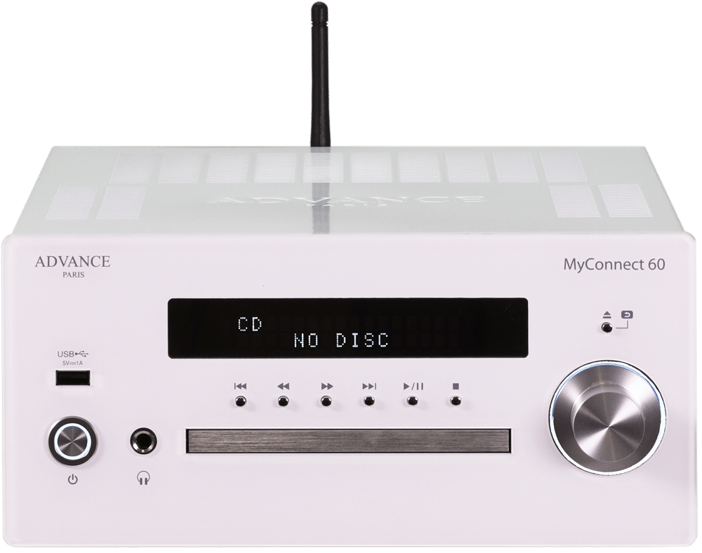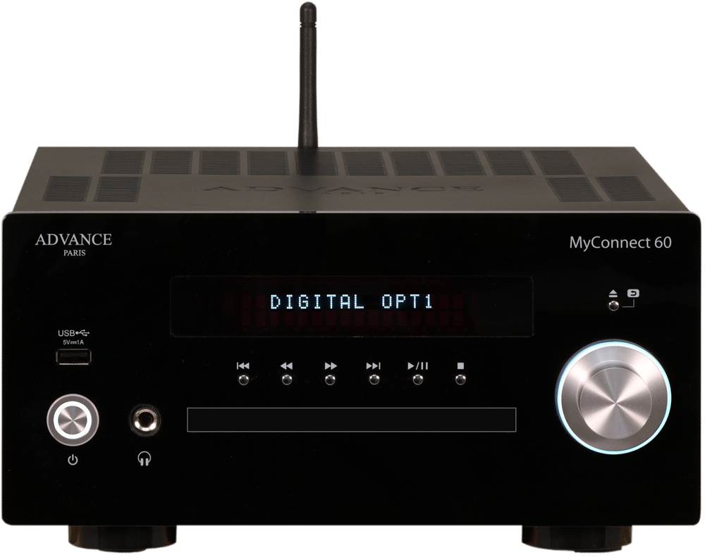 Advance Paris MyConnect 60 är en audiofil allt-i-ett förstärkare med en inbyggd 2x60W-förstärkare, en wifi nätverksspelare, en DAB+/FM-tuner, en CD-spelare, en USB-läsare och en Bluetooth-mottagare.