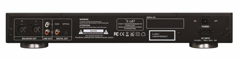 Utrustad med koaxial (RCA) och optisk (TOSLINK) digitala utgångar, obalanserade (RCA) och balanserade (XLR) analoga utgångar, är X-CD7 den idealiska CD-spelaren för ditt Hi-Fi-system och din stora CD-samling.