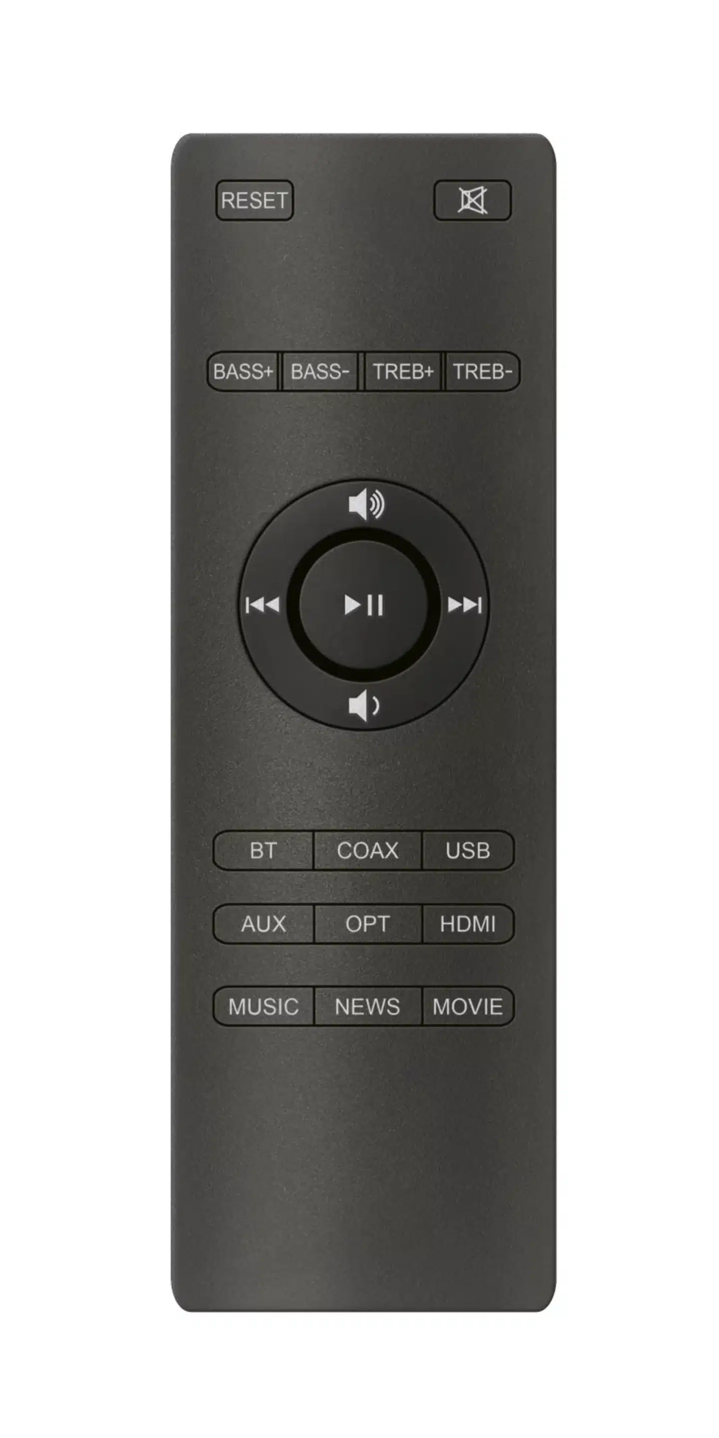 Den har också en fjärrkontroll för viktiga funktioner som volym-, bas- och diskantkontroller, samt val av källa.