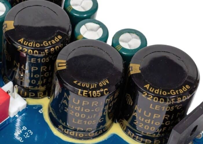 - Anpassade effektkondensatorer – Dessa kondensatorer är konstruerade speciellt för Nuprime och ger förbättrad momentan strömleverans, vilket säkerställer att förstärkaren kan reagera omedelbart på dynamiska musikaliska krav.