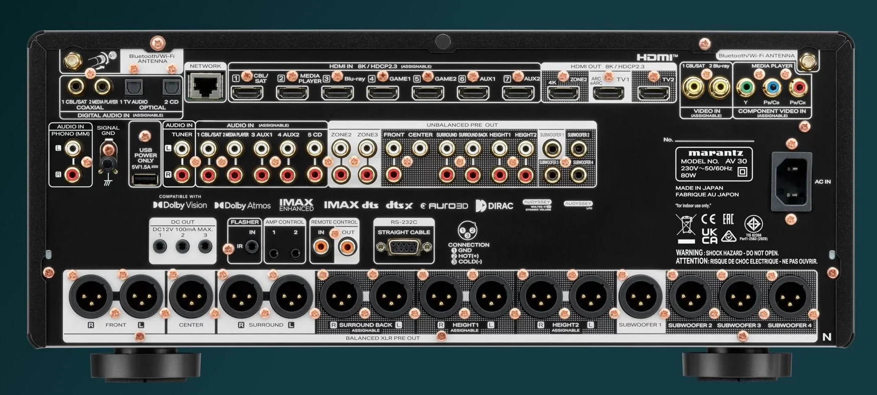 Tack vare ett generöst utbud av både analoga och digitala anslutningar samt en mängd funktioner för skräddarsydda installationer, passar AV 30 lika bra i mindre mediarum som i avancerade hemmabioanläggningar. Levererar upp till 11.4 kanaler via både RCA och XLR, vilket ger maximal flexibilitet vid systemdesign.