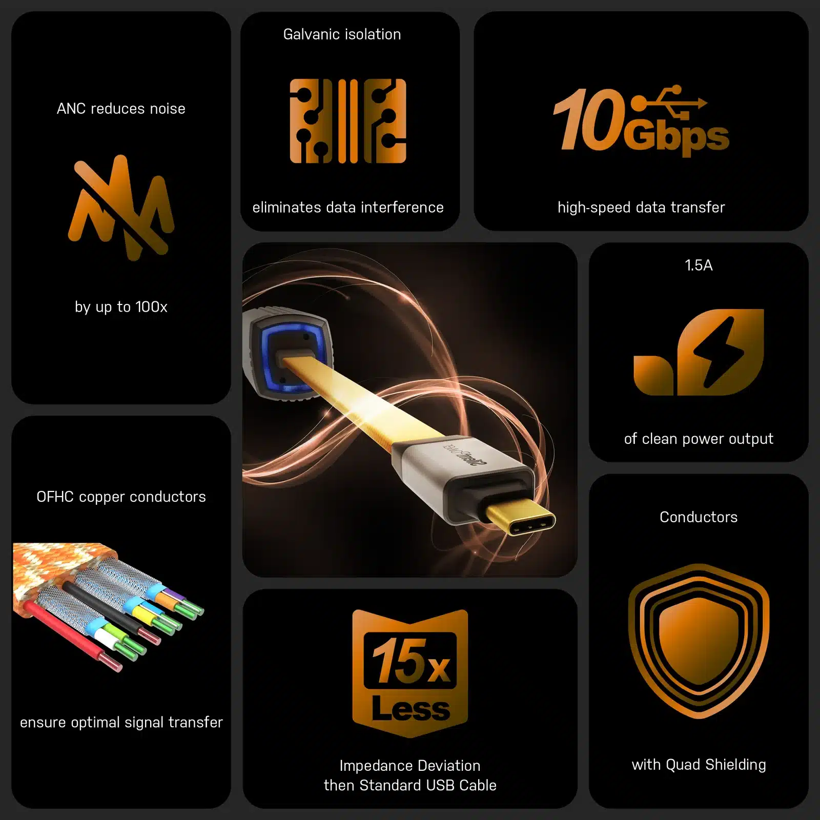 Fyra lager av skärmning omger ledarna, vilket ger exceptionellt skydd mot externa störningar. Denna design ger optimal signalöverföring för ett verklighetstroget ljud, med en stabil impedans på 90 ohm med upp till 15 gånger mindre avvikelse än många avancerade USB-kablar.