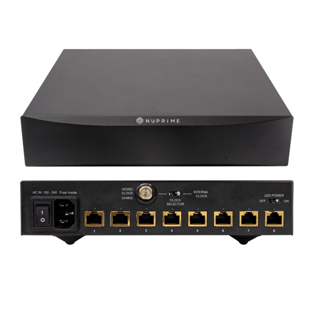 NuPrime SW-9X är en avancerad 8-ports gigabit Ethernet-nätverksswitch med inbyggd låg brusströmförsörjning, AC-filter och jordskärmning.