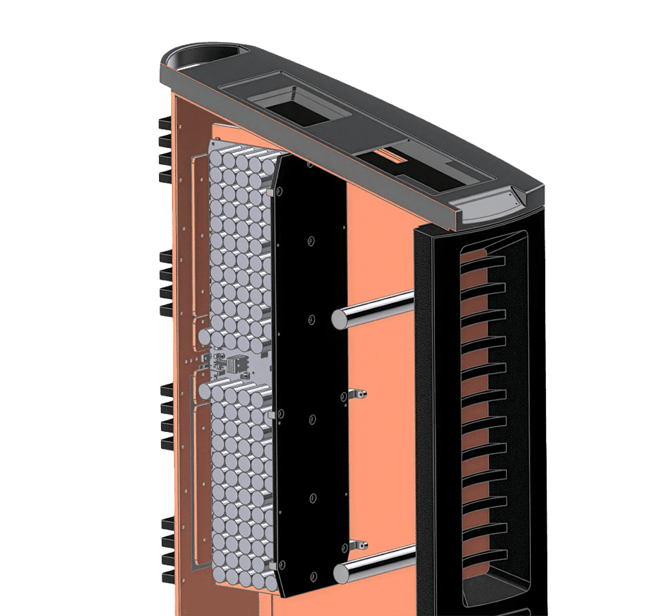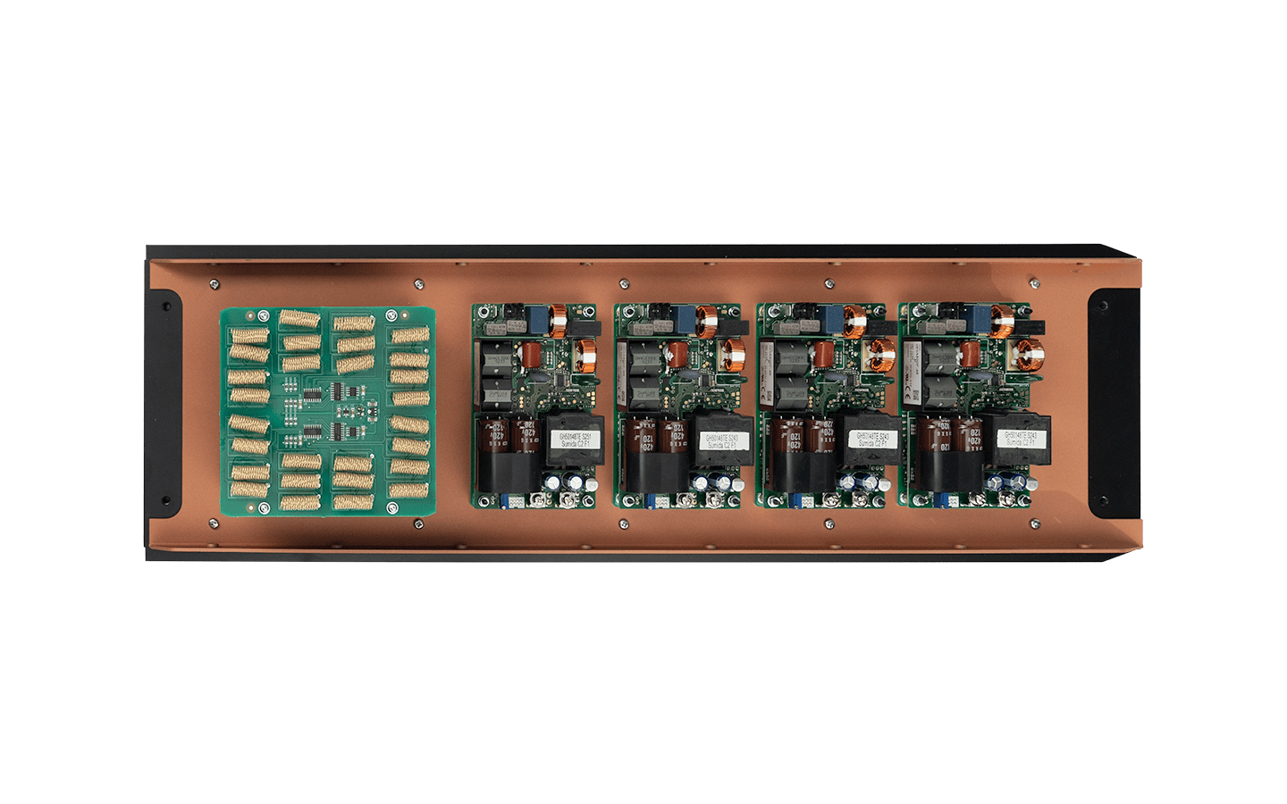 Till skillnad från konventionella switchande nätaggregat som genererar fyrkantsvågor, producerar resonanslägesaggregat i sig sinusformade vågformer, vilket dramatiskt minskar bruset. Varje aggregat är klassat till 500 W och 20 A och matar en betydande lokal strömbank på totalt 266 mF, som kan lagra upp till 1 050 J energi och leverera toppströmmar på upp till 130 A.