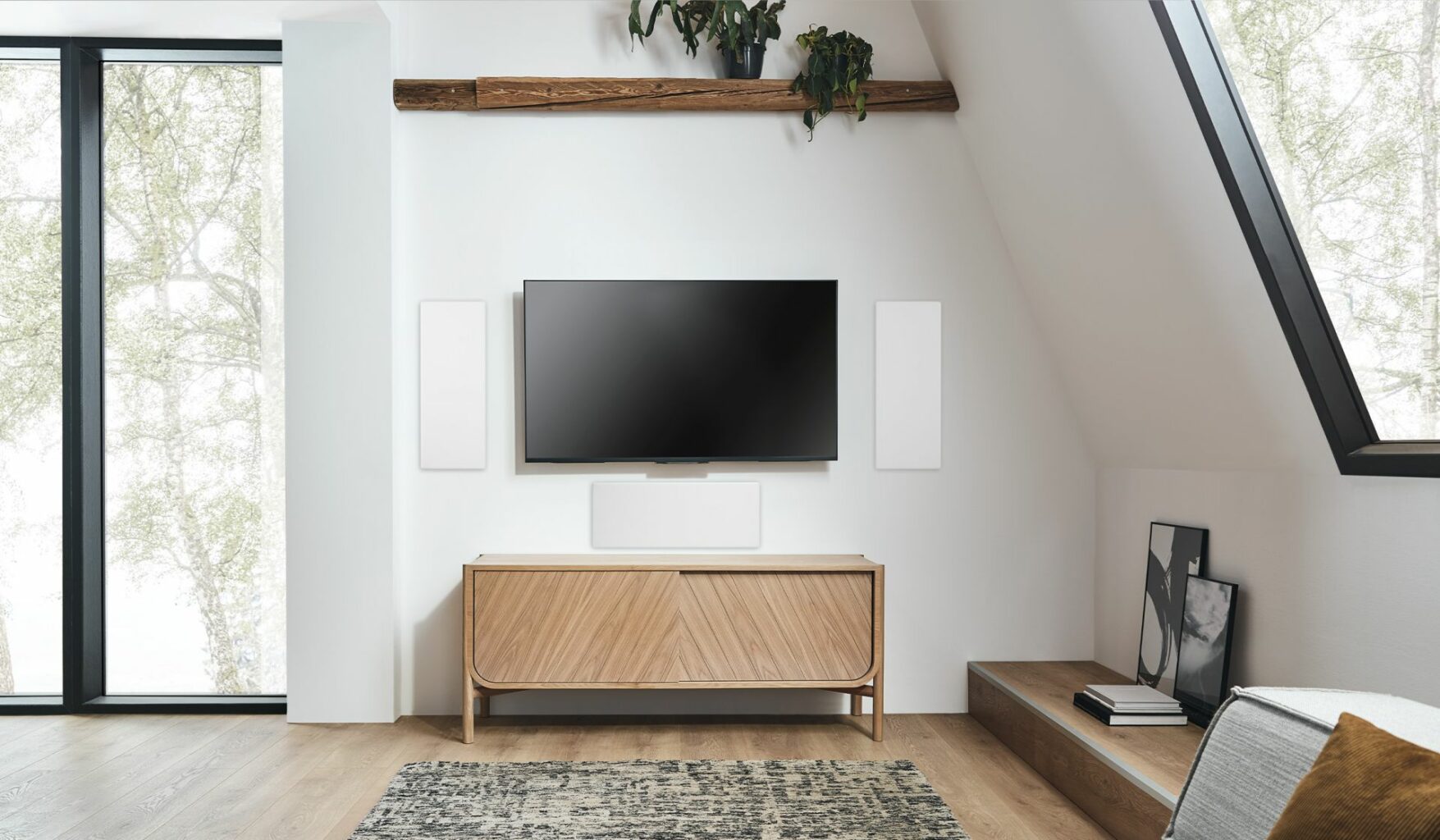 De ultraplatta högtalarna – med ett djup på mindre än 10 cm – smälter harmoniskt in i alla boendemiljöer och kan integreras perfekt i moderna rumskoncept.