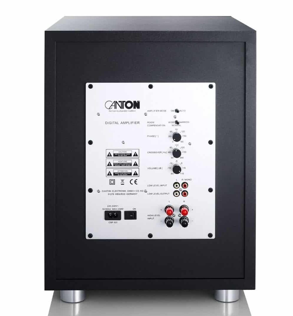 Dess inbyggda förstärkare levererar 330 watt toppeffekt, med stöd av Cantons SC-teknik (Soft Clipping) för att minimera distorsion och skydda systemet vid höga volymer.