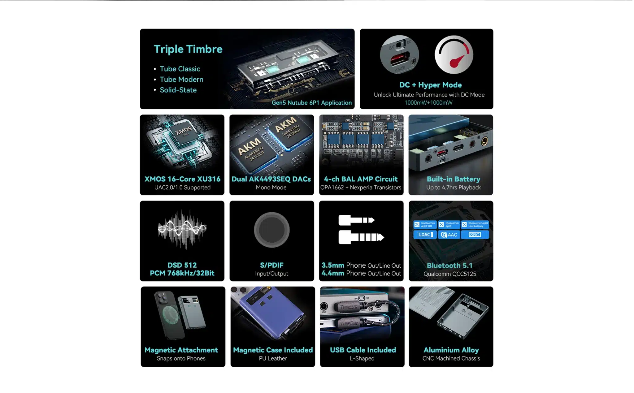Ergonomin har fått särskild uppmärksamhet med fysiska knappar placerade på högra sidan: ström och val av klangläge. Anslutningarna, samlade på undersidan, inkluderar två hörlursutgångar (3,5 mm obalanserad och 4,4 mm balanserad), en tvåvägs SPDIF-port, två separata USB-C-portar (en för ljud, en för strömförsörjning) samt en BAT/DC-omkopplare för att växla mellan batteridrift och “Hyper”-läge via nätström.