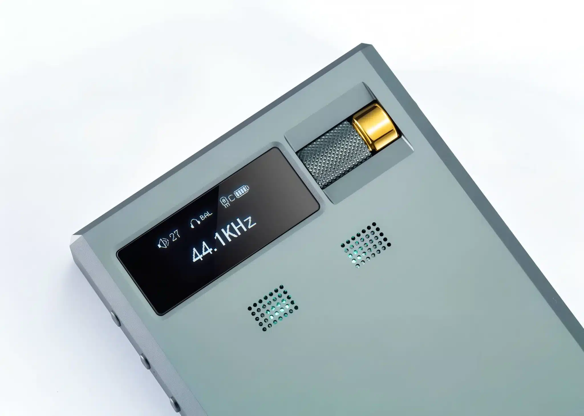 Fronten pryds av en 0,96-tums OLED-skärm omgiven av ett räfflat volymhjul i metall. Detta hjul, med noggrant kalibrerat motstånd, möjliggör exakt volymjustering i 100 steg.