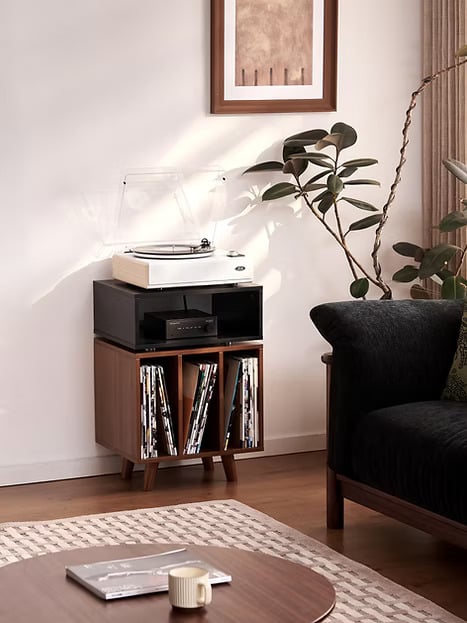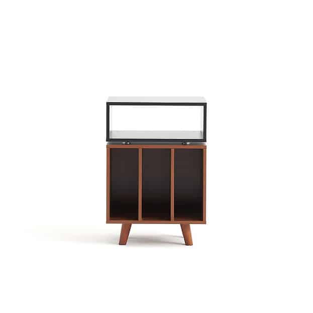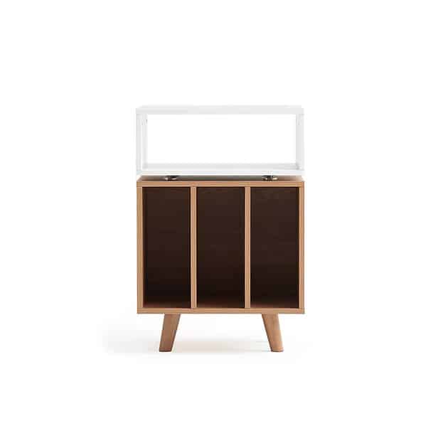 Dess nedre hylla inrymmer en förvaringsenhet för vinylskivor uppdelad i tre vertikala fack med plats för upp till 80 skivor.
