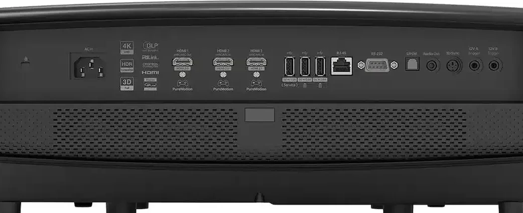 Optoma UHZ78LV-projektorn har omfattande anslutningsmöjligheter med tre HDMI-ingångar, varav en är 2.1 och en annan eARC-kompatibel för digital ljudåterkoppling till en hemmabioreceiver.