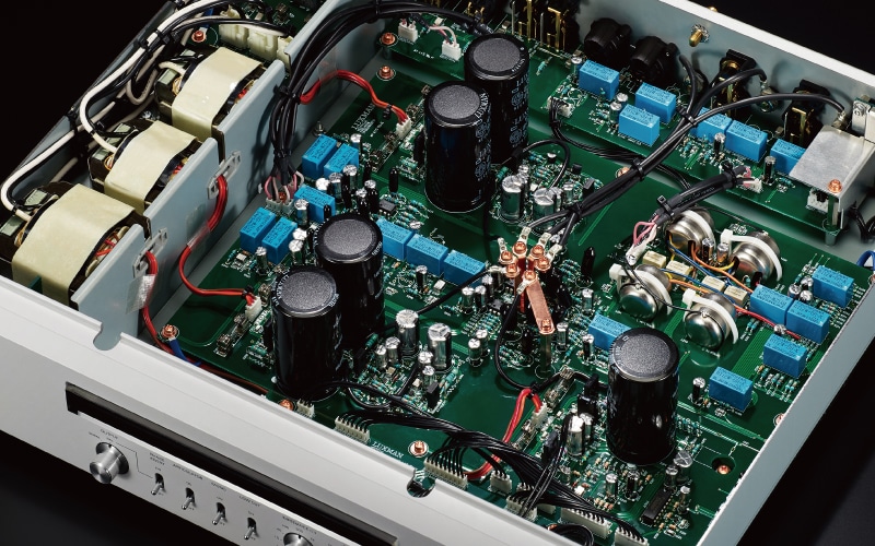 E-07 har totalt tre robusta krafttransformatorer, konfigurerade oberoende för vänster och höger ljudbehandlingskrets, samt en separat transformator för indikator- och reläkretsarna. Denna design skapar en idealisk strömförsörjningsmiljö där belastningsfluktuationer i varje kretsblock inte stör varandra. Dessutom är den utrustad med utmärkt, oberoende strömförsörjningsreglering som ger en extremt stabil strömförsörjning, tack vare våra blockkondensatorer av effektförstärkarkvalitet med hög kapacitet (10 000 μF x 5).